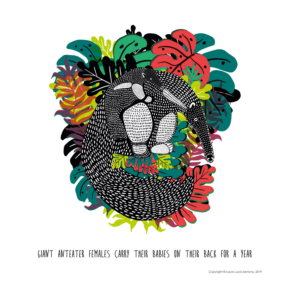 High resolution, 50x50 cm size, Giant Anteater Mother and Baby Illustration.