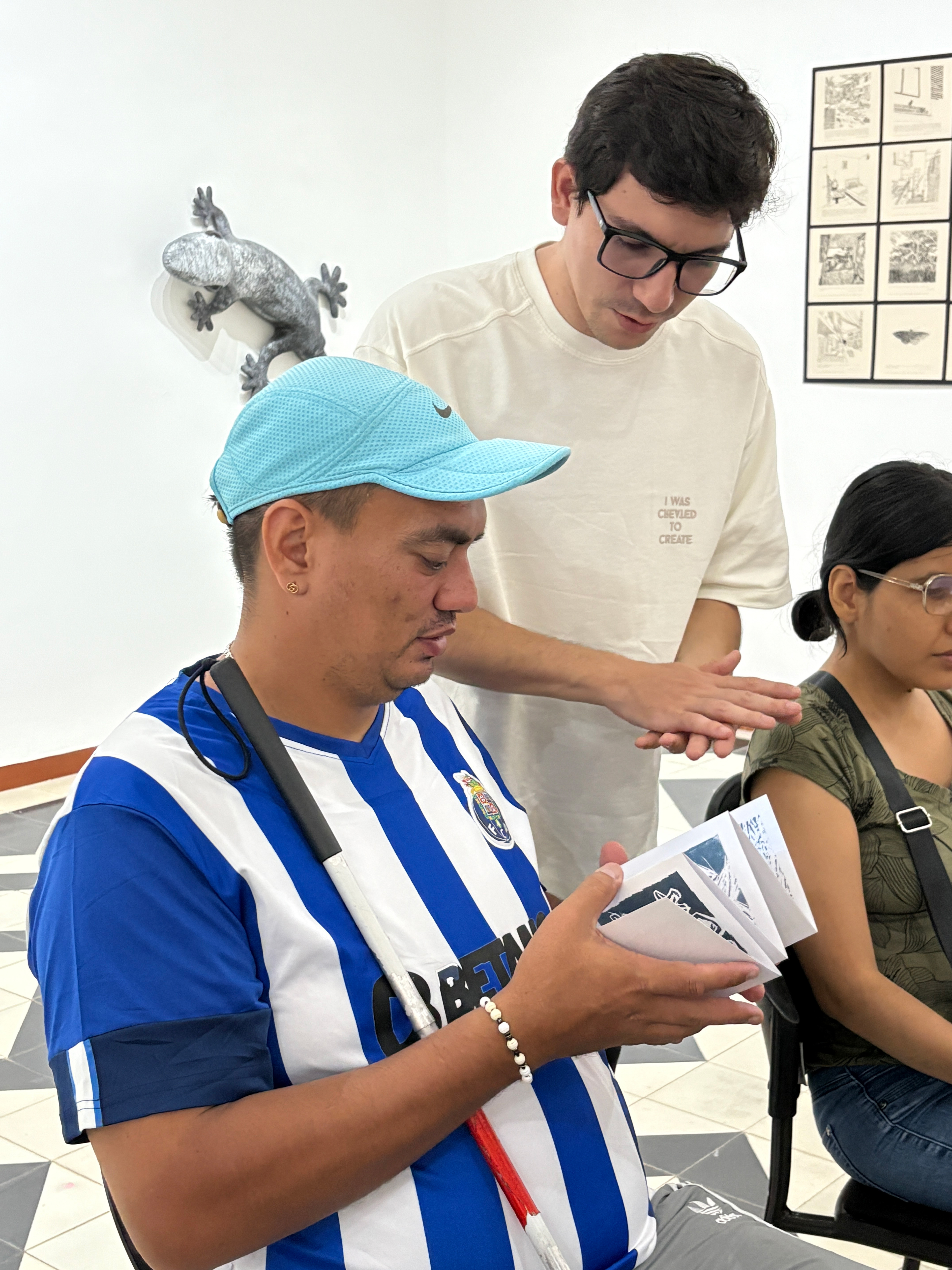 Visita guiada para personas con discapacidad visual en la que apreciaron las piezas táctiles tridimensionales, así como las narraciones en las que algunos de ellos formaron parte del proceso de creación. De igual forma, todas las piezas de la exposición contaron con detonadores QR con audio para ampliar la experiencia.